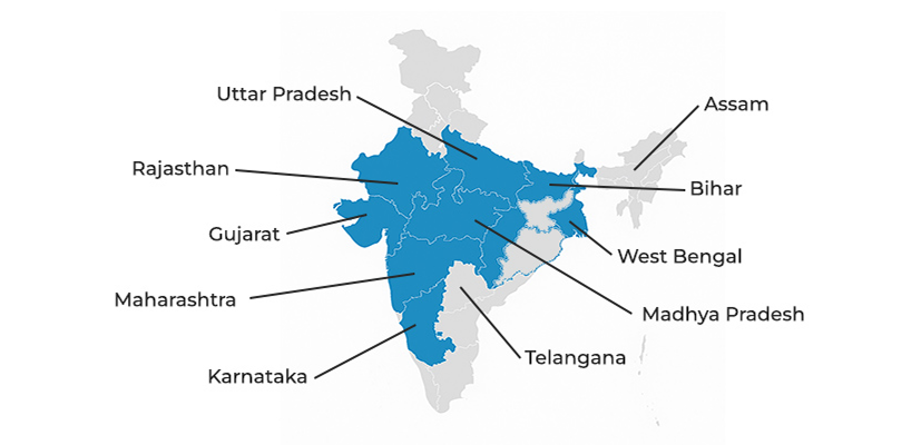Maharashtra · Karnataka · Gujarat · Rajasthan · Uttar Pradesh · Madhya Pradesh · Telangana · Bihar · Assam · West Bengal